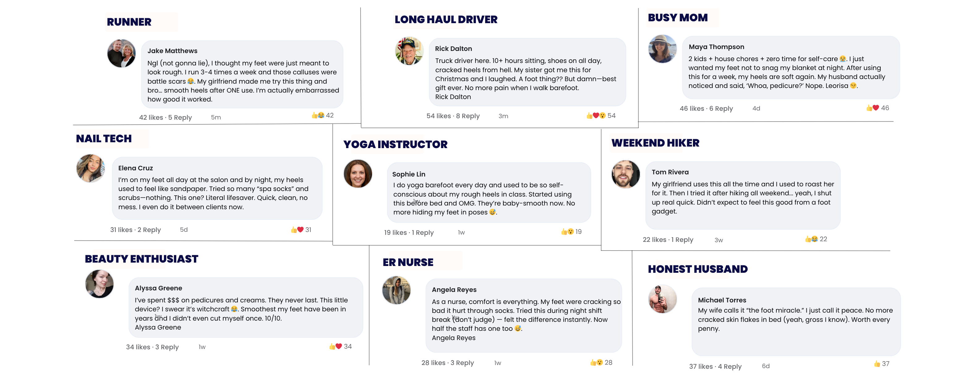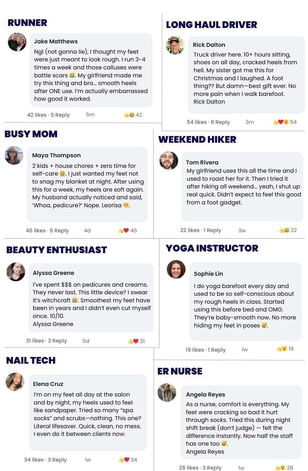 Busy mothers, nurses, workers, and seniors use Leorisa every day—proof that smooth, healthy feet are not a luxury, but everyday comfort.
